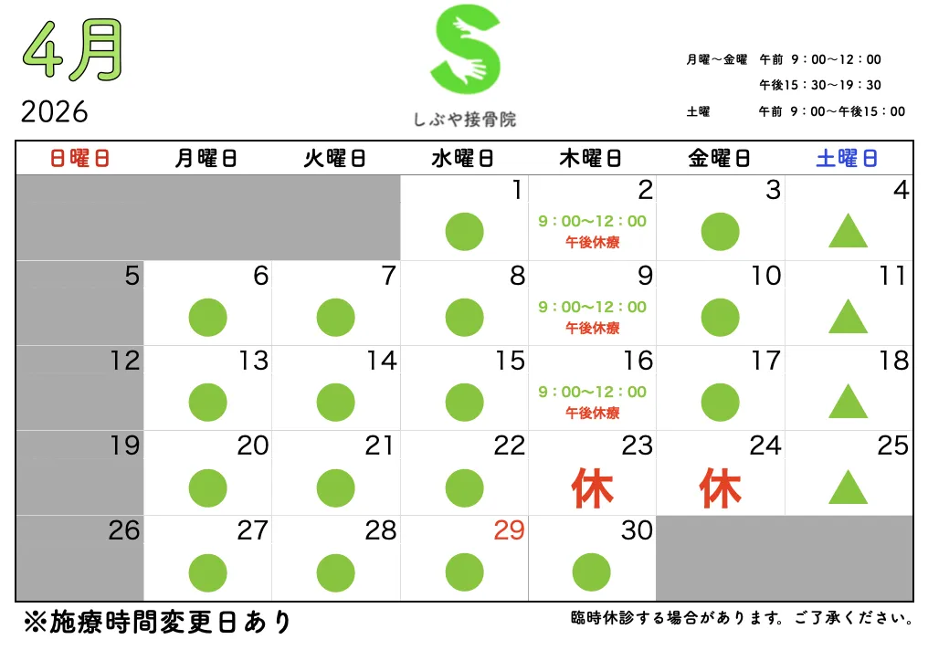 4月施療日カレンダーの配信です! 新年度がスタート目前で暖かく過ごしやすい日が増えてくる時期ですね😊 環境の変化で体調を崩しやすい時期でもあります。 新学期に入り新たな部活動やスポーツを始めるかたも多く、運動量が増える季節です🏃♂️⚽️